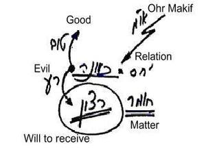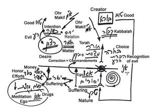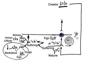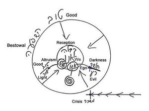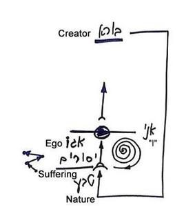 The Wisdom of Kabbalah states that ego has to be big. You must develop to your maximum ego and determine that it is evil. It is so foul that you transform it into good (see arrows on the right in the drawing).