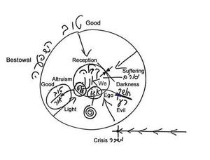 Moreover, I attain the qualitatively different recognition of evil. It is no longer the reason for my suffering and thus I must run away from it. This is how things are at the bottom (look at the lower right part of the drawing), when my ego brings me bad sensations. The whole world advances this way, and, regrettably, we see what is happening with them.