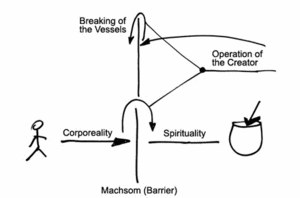 Let’s put is this way, we have the Machsom (barrier) separating spirituality and corporeality. A person is found here - that corporeal person and that’s the spiritual. From spirituality to corporeality, we can descend to the very last level, but not below. To skip over this degree, there was a breaking here – the breaking of the Kelim (vessels). It happened through the force of the Creator that confused the Partzufim. We learned that. Also, when a person wants to return from corporeality to spirituality, he also uses the same force as the Creator. This is called “the thought of Creation to do good to his creatures being above nature,” because all of this is nature. Except this act, which is the act of the Creator, everything else is a system.