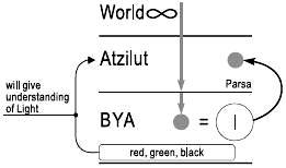 That is, the World of Atzilut is a mount, while all the letters, colors and their permutations are determined by our coordinates in the Worlds of Beria, Yetzira, and Assiya. As the light of Infinity passes through the World of Atzilut and enters the Worlds of BYA, we can be in and receive the light in them, or we can rise to Atzilut and receive the light there.