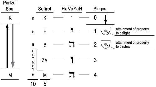 From the study of the four phases of development of the direct light, we know that these phases (zero, one, two, three, and four) are respectively called “the tip of the letter Yud”, the letters “Yud”, “Hey”, “Vav”, and “Hey”. They make up the word HaVaYaH, the Creator’s ineffable name.