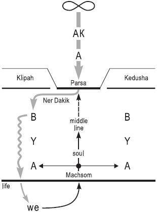 Moreover, we can imagine the worlds from top down, A"K (the world of Infinity), then Atzilut, Beria, Yetzira, Assiya (the pure worlds) and Beria, Yetzira, Assiya(Klipot). The Parsa is under the world of Atzilut, and our world is under the Klipot. That which enters from Malchut of the world of Atzilut through all the worlds and comes to the impure worlds, refers to Ner Dakik (a small candle, a small luminescence). When the Ner Dakik descends to the Machsom and reaches us, we receive what is referred to as “our life”.