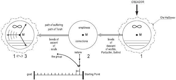 There is an opportunity to pass from the first state to the second and then from the second to the third in the following way: from the first state, we pass to the second by descending the so-called levels of descent (the worlds, Partzufim and Sefirot). This process is usually depicted as one unfolding from up downwards, from the World of Infinity to our world. The passage from the second state to the third constitutes the levels of ascent (correction) of the souls. Naturally, we do not exist between the first and the second stages; there are no created beings yet. The path of creation starts between the second and the third states.