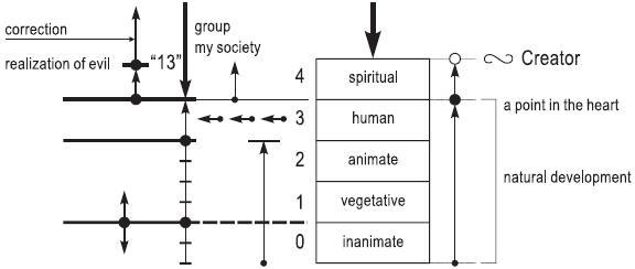 In every one of us, there are five levels of desires: still, vegetative, animate, human, and spiritual. Zero, one, two, three, and four are five types of desires (or five types of Dargot Aviut), five kinds of ego. This is the way people evolve. However, if the person reaches a level where he passes from human desires to spiritual ones, a point in his heart emerges and he starts to feel something. This point is a beginning of the spiritual desire, while the end of it is similarity to the Creator. Such is the way of correction.