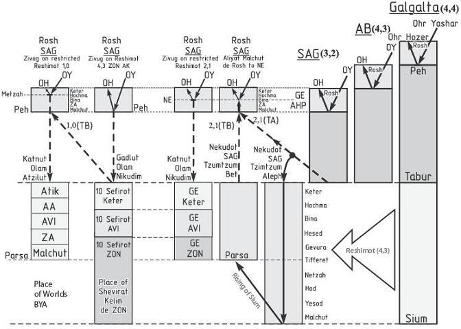 As the Light exits Partzuf SAG, it rises through those stages of a Partzuf we learned about (see figure 4). When the Light exits the interior Bina level of that Partzuf, the Reshimot that are left are (2,2), the exact combination of giving that is needed in order to lower beneath Tabur. And this is precisely what happens.