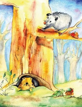 “Opossum!” said Groundhog poking his head out of the tree stump. “What are you doing at the top of my burrow?”