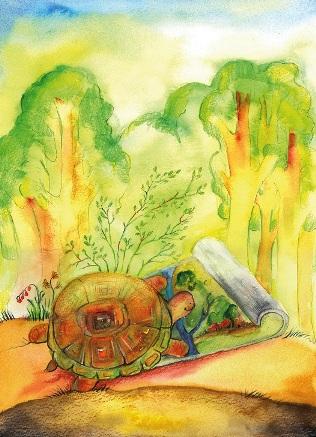 The tall trees in the green forest were moving with the wind. The leaves were playing a soft melody and the sun was rising. Underneath a warm sunbeam, Sammy the Turtle’s little head poked out of his armor.