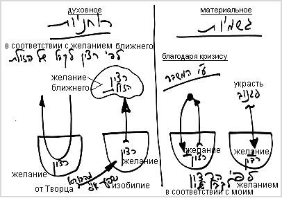 Сегодня в этом мире мы находимся в состоянии такого кризиса, что даже с помощью взаимообмена, отдавая и получая взамен, не можем наполнить себя. Эти две формы получения исчезают, становятся невозможными для нас. Благодаря кризису мы видим, что не способны отдавать даже ради получения. Я не могу положить деньги в банк и получить их обратно, я не могу работать на хозяина и получать зарплату, владелец одного предприятия не может продать другому свою продукцию, чтобы получить прибыль – все это уже не работает! В итоге мы будем вынуждены перейти от материальной формы существования, которое находится под угрозой разрушения, к духовной.