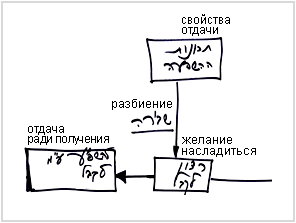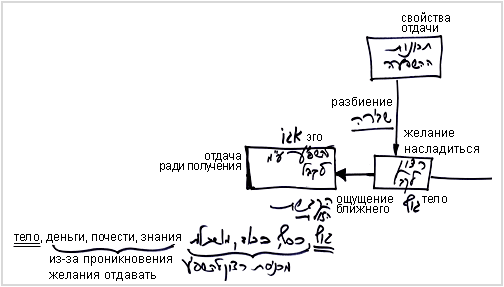 Посредством свойства отдачи желание насладиться начинает отдавать ради получения. В связи я этим, оно растет и начинает ощущать ближнего, т.е. желает получить то, чем владеет ближний. Таким образом, кроме своего тела и физических желаний, благодаря проникновению желания отдавать, в желании насладиться возникает желание к деньгам, власти и знанию.
