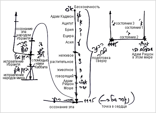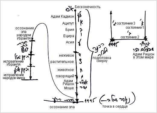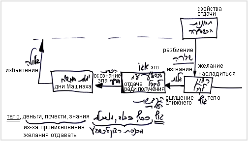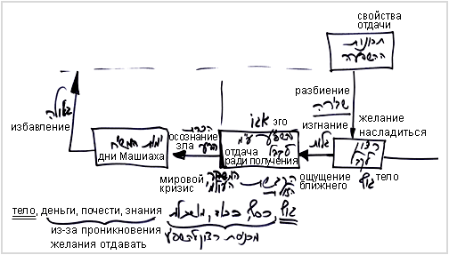 После смешения и совместного развития, которое называется периодом изгнания, творение достигает осознания зла. А затем наступает состояние, в котором творение чувствует, что невозможно продолжать существование в состоянии отдачи ради получения и получения ради получения, а необходимо исправляться – это называется «днями Машиаха».