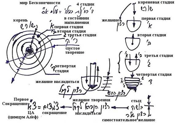 Таким образом, образуются пять парцуфим, поскольку существует возможность работать со всеми стадиями малхут мира Бесконечности: со всей четвертой стадией (малхут), с половиной третьей стадии, с меньшей частью второй, еще меньшей – первой, и еще меньше – корневой. Всего в малхут мира Бесконечности есть пять решимот, с которыми она работает.