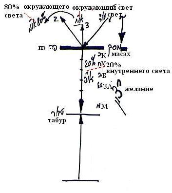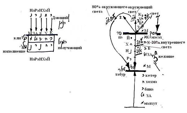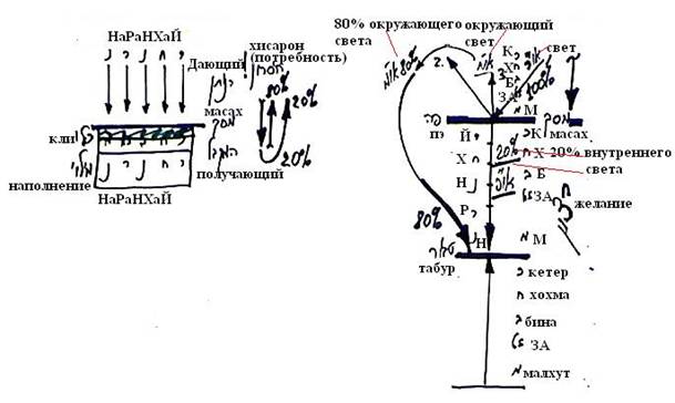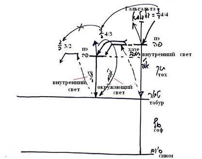 И здесь снова от приходящего прямого света произошло столкновение внутреннего и окружающего светов, но этот прямой свет приходит через парцуф Гальгальта. Масах, стоящий на новом уровне пэ, делает зивуг дэ-акаа, и получает свет ради отдачи. И все это происходит на решимот 4/3.