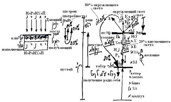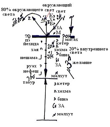 Отсюда мы видим, что только часть малхут мира Бесконечности от пэ дэ-Гальгальты и до ее табура получила 100% наполнение. Допустим, она наполнилась на 20% в парцуфе Гальгальта, затем в АБ, САГ, МА и БОН и, в результате, эта часть наполнилась на 100%.