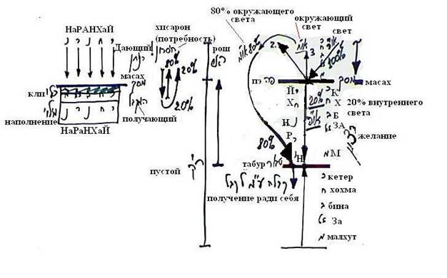 Эта вершина достигается только благодаря тому, что эта часть сможет получить ради отдачи и быть в состоянии отдачи. И мы видим, что у этой части еще нет масаха для получения ради отдачи. Есть только масах, чтобы оттолкнуть свет, не дать ему проникнуть в эту четвертую стадию. Этот масах или стоит в пэ дэ-рош, или спускается в табур, но он всегда следит за тем, чтобы не дать свету войти в четвертую стадию, в соф парцуфа.