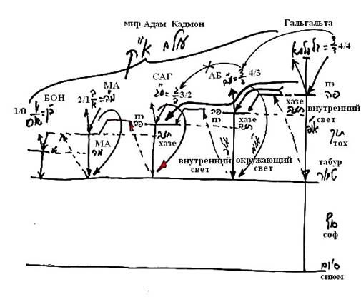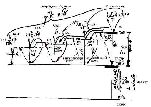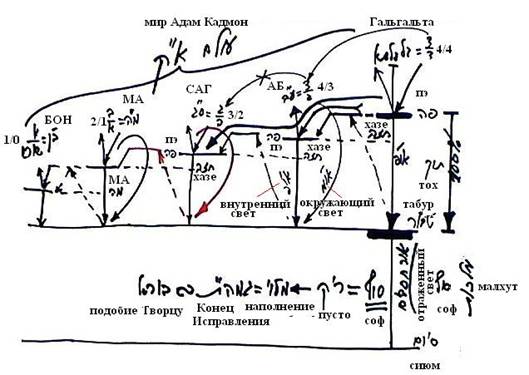 Малхут уже работает с корневой, первой, и второй стадиями. И этот парцуф тоже распространяется в тох от пэ, который находится на уровне хазе парцуфа АБ, и этот парцуф называется САГ (это его гематрия – числовое значение парцуфа). В нем тоже происходит битуш – столкновение внутреннего и окружающего светов, и он тоже освобождается от светов и приходит к решению, что он уменьшит уровень получения света и получит ради отдачи, но на основе решимот, которые остались после парцуфа САГ – 2/1.