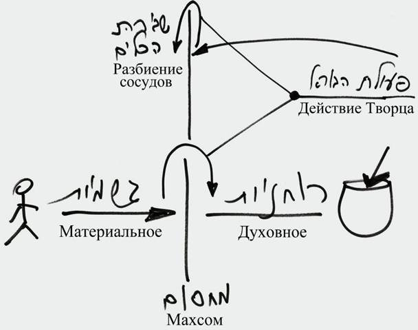 Махсом лежит между духовным и материальным. Нарисуем человека в материальном виде слева и в духовном виде справа. Из духовного по направлению к материальному можно спускаться до последней духовной ступени, но не далее. Чтобы перескочить через эту ступень, было произведено разбиение сосудов. Сделала это сила Творца, которая запутала парцуфим. Соответственно и на обратном пути, когда человек хочет перейти из материального в духовное, он использует всё ту же силу Творца. Это означает, что замысел творения о принесении блага Его созданиям находится над природой. Ведь всё является природой, кроме этого действия Творца. Всё остальное – система.