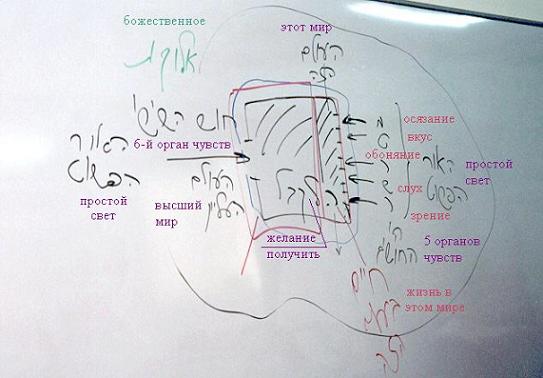 Kогда мы живем в этом мире, мы ощущаем через 5 обычных органов чувств. Если мы умираем и покидаем этот мир, то ощущаем через шестой орган чувств. А каббалисты особенны тем, что для них не важно: живут они в этом мире или умирают, задействуют ли они 5 органов чувств в этом мире или нет,- они могут использовать все органы чувств вместе.