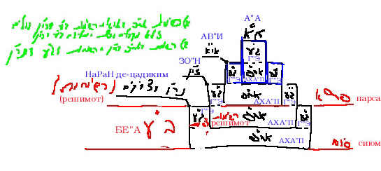 Из ночного урока от 06-го июня ТЭС, часть 9-я "Зивугей аСфирот", пункты заин-хет (7-8) 7) <Не существует вообще "мэйн нуквин", которые бы исправлялись с первого раза. В первый раз "мэйн нуквин" поднимаются просто как желание, но во время второго зивуга они исправляются и выходят из них исправленные души и творения> (души и творения – это одно и тоже) <и облачаются в тело этого мира>. После первого зивуга еще ничего нет, после второго – уже есть тело, в которое облачается свет, называемый "душа". <В первый раз МА"Н де-ЗО"Н> (души праведников) <поднимаются в виде решимот, включенных в "катнут" (малое состояние) высшего в виде МА"Н в "алей эльон" (в "сверхвысший" - на две ступени выше).> Например, души НаРа"Н желают, чтобы вместо решимот, которые есть у них сейчас, иметь нечто реальное. Решимот НаРа"Н находятся под парса, они не могут самостоятельно подняться в Ацилут – они еще не исправленные. Исправленным называется имеющий минимальный экран, то есть состояние "катнут" (малое). У них нет еще такого состояния, только желание, решимо, т.е. желание обрести экран – то, что приобретают души праведников в подготовительной работе, когда просят исправления у АХА"П де-ЗО"Н де-Ацилут, которые находятся в них в качестве "эльон" (высшего). АХА"П де-ЗО"Н де-Ацилут, которые находятся под парса на той же ступени, что и НаРа"Н праведников, также существуют в виде решимот. У них нет келим с экраном, а только решимот. У нас здесь имеется два вида решимот: решимот АХА"П де-ЗО"Н, находящиеся под парса, на которые одеваются решимот НаРа"Н праведников. <Решимот НаРа"Н праведников включены в катнут де-ЗО"Н в виде МА"Н> (однако они не относятся к катнут де-ЗО"Н, они находятся на одной ступени с решимот АХА"П де-ЗО"Н, но ЗО"Н сейчас существует только в виде катнут), <когда ЗО"Н благодаря просьбе НаРа"Н праведников поднимаются к высшему - АБА ве ИМА с просьбой МА"Н о постижении света мохин де-гадлут для того, чтобы выстроить свой АХА"П и обеспечить необходимое для НаРа"Н праведников, тогда они берут с собой МА"Н НаРа"Н праведников,> т.к. они и являются причиной, заставляющей ЗО"Н подниматься к "алей эльон". НаРа"Н праведников определяют, что именно ЗО"Н будет просить у АВ"И (АБА ве ИМА): какой свет, какой экран, – именно нижний определяет вид зивуга. <Пока не произошел зивуг де-гадлут де-ЗО"Н находятся АХА"П де-ЗО"Н и НаРа"Н праведников на одном уровне под парсой в виде решимот, включенные один в другой. И получается, что зивуг, который прошел на этот МА"Н, что поднялся в АБА ве ИМА, произошел конечно же и на НаРа"Н праведников> (так как именно они запускают весь этот процесс) <как и АХА"П де-ЗО"Н> (оба эти желания находятся сейчас в АБА ве ИМА) <оба эти решимо соединены вместе, но несмотря на то что они объединены одним желанием, зивуг в АБА ве ИМА ничего не исправляет в НаРа"Н праведников, а необходим только для восполнения АХА"П и получения света мохин де-гадлут ради ЗО"Н.> АБА ве ИМА сейчас дают силы, экран для ЗО"Н родить свой АХА"П, тогда ЗО"Н получит гадлут и сам совершит зивуг, чтобы родить Г"Э душ праведников. <После этого зивуга, когда проверяется первое свойство их Ма"Н, т.е. АХА"П де ЗО"Н,> АХА"П де ЗО"Н будут существовать в виде тела, а не только решимот. Тело – имеется в виду решимот с экраном, <тогда спускаются ЗО"Н со вторым свойством, оставшимся в нем без исправления> (на это свойство также состоялся зивуг в АБА ве ИМА – н