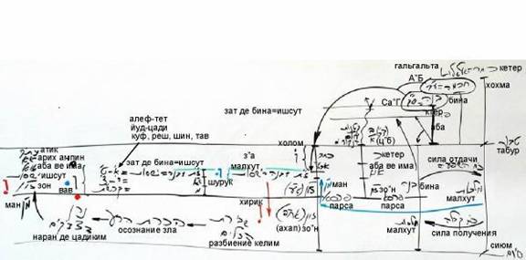 Рис. 3 Поскольку они не могут правильно рассчитать, что с ними происходит, то возникает следующая картина: малхут пробуждает ЗОН, просьба от ЗОН восходит к Име (эта просьба называется МАН) – и тогда Има начинает получать свет свыше. Этот свет, нисходя свыше к парцуфу Аба, называется «холам». Когда этот свет, за счёт МАНа со стороны малхут, входит в парцуф Има, то называется «шурук». Когда же он проходит от Имы вниз, к ЗОН, то называется «хирик». Почему это так? Все сосуды, расположенные от ЗАТ бины и до конца ЗОН (т.е. ЗАТ бины, называемый ИШСУТ, зеир-анпин и малхут), называются буквы. Буква вав (прим.: на ней основаны огласовки холам, шурук, хирик) символизирует линию кли, работающего «по прямой» (йошер), т.е. получая ради отдачи, от кетера до малхут. Каждое кли изображается буквой: ЗАТ бины соответствует буквам от алеф от тет, Зеир-Анпин – от йуд до цади, малхут – куф, реш, шин, тав. Все эти буквы в совокупности обозначаются буквой вав. Если свет находится над буквой вав, то называется холам (прим.: холам – вав с точкой над ней). Если внутри вав – шурук. Если же свет проходит вниз и действительно входит в желание получать, то называется уже хирик. Итак, признак разбиения – то, что свет проходит под строку букв. ...Чем мы занимаемся в мире Ацилут? Если бы свет не прошёл парсу, наполняя келим лишь выше парсы, т.е. если бы АХАП поднялся над парсой, то все наполнились бы высшим светом и не было бы разбиения! Как же сделать так, чтобы разбиения не произошло? В Ацилуте у нас для этого есть особое исправление: все разбитые, находящиеся внизу сосуды, пройдя этап осознания зла, становятся душами праведников – НАРАН де-цадиким. Они теперь возносят МАН, желая подняться, а поднявшись, получают соответствующее наполнение в Ацилуте, который, как мы знаем, состоит из парцуфов: Атик, Арих-Анпин, Аба-ве-Има, ИШСУТ, ЗОН. Здесь, в парцуфе ЗОН, мы получим весь тот свет, что был прежде ниже парсы: свет этот называется светом хирика, а метод, которым келим наполняются так, чтобы не произошло разбиения, называется работой с экраном хирика. Вот, собственно, и всё. Именно это мы теперь и будем подробно обсуждать: буквы холам, шурук, хирик – т.е. то, как получить свет таким образом, чтобы с нами не случилось разбиения. 9. Та точка посеяла внутри того чертога тайну трёх точек: холам, шурук, хирик – и включились одна в другую, и сделались единой тайной – голосом, исходящим в единой связи. В час, когда вышел, – вышла с ним его супруга, включающая все буквы, ибо написано «небеса» (эт а-шамайим; эт – предлог вин. падежа) – голос и супруга его. Голос этот, т.е. небеса, есть последнее Эхъе. Сияние, включающее все буквы и цвета таким образом. И знай, что три эти осеменения называются холам, шурук, хирик. Первое осеменение – это (ашер) голова (рош), вышедшая из начала (решит) – называется холам. Второе осеменение, когда сменился цвет того чертога, с цвета хасадим на цвет хохмы и стало скрытым сиянием, называется шурук. А третье осеменение, когда поднялись в них ЗОН со своими буквами ЭЛОХ (когда ЗОН Ацилута, будучи в малом состоянии, поднял свой АХАП из-под парсы с МАНом праведников, т.е. с их душами, с разбитыми келим) и уменьшилась твуна, вынашивая ЗОН (который вошёл в неё), – называется хирик. А смысл вещей в том, что тайна букв – сосуды, а точка холама стоит над буквами, являющимися сосудами. Так, во время исхода бины из