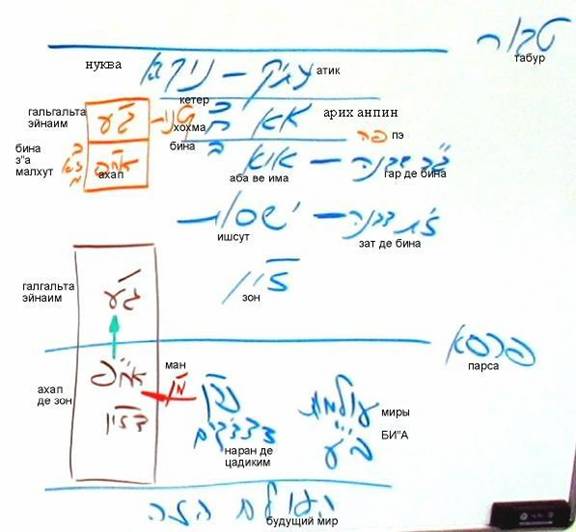 С точки зрения к «одевания» низшего на высшего, существуют следующие точки: йесод, являющийся местом зивуга (соответствует половому органу), тифэрет, где находится табур (пуповина), даат, т.е. пэ (рот). Когда мы будем изучать строение нуквы, то там сама сфира тифэрет будет делиться на верхнюю, среднюю и нижнюю трети: хазэ (грудь), табур (пуповина), йесод (основа). Мы увидим, каковы корни всех этих понятий... На этом мы сегодня закончим. Не пугайтесь множества терминов: мы, в итоге, всё время будем изучать одну и ту же тему – пока не ощутим, что находимся внутри неё. У нас еще много материала, на котором мы сможем тренироваться. Но каждый раз он будет нам всё более близким и знакомым, мы будем жить в нём. Это приведёт к тому, что мы войдём в него. Сейчас все приглашаются на трапезу. Хочу лишь добавить, что с нами вместе были наши товарищи из Миннесоты, Сдерота, Лондона, Хайфы, Киева, Петах-Тиквы, Нижнего Новгорода, Тюбенгера, Калининграда, Филадельфии, Тель-Авива и многих других мест. Всем – большое спасибо за участие. Шалом.