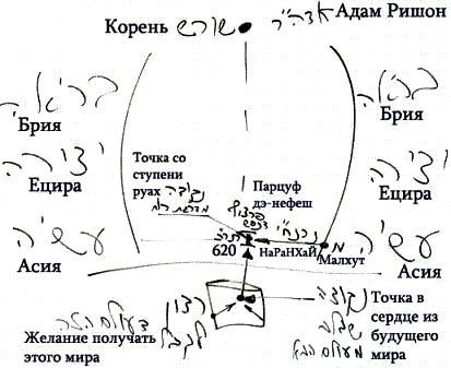 Есть желание получать, а внутри него есть точка. Желание получать называется «сердцем», а точка в нем называется «точкой в сердце». Эта точка в сердце становится теперь парцуфом, который начинает получать свечение от Малхут мира Асия. Света из Малхут дэ-Асия приходят к точке в сердце, а из нее светят другим желаниям – в «сердце» или в «тело» человека.