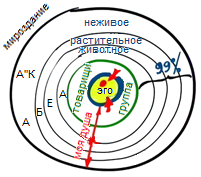 Есть мироздание, внутри которого нахожусь я, мое эго, со своей точкой в сердце. Самый близкий ко мне круг – это группа, товарищи. А потом весь остальной мир: человечество, животная, растительная и неживая природа. Или можно рассматривать это как миры, с которыми я работаю: Асия, Ецира, Брия, Ацилут, Адам Кадмон.