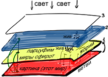 По мере подъема я приближаюсь к свету через пласты своего желания. В самом низу я вижу картину "этого мира". Затем я поднимаюсь на следующую ступень, к желаниям, которые ближе к свету, – и те же силы предстают передо мной в виде парцуфим, миров и сфирот. Тогда мне уже видна во всем связь ветви и корня – и соответственно, формы, ощущаемые мною как желания и соотношения сил, я называю по именам их аналогов из нашего мира. Так и возникает язык ветвей.