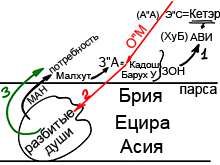 Затем через всю эту цепочку вниз спускается окружающий свет (ор макиф – О"М) и светит душам. Получив его, они на деле начинают подниматься и в уже исправленном виде включаться в мир Ацилут.