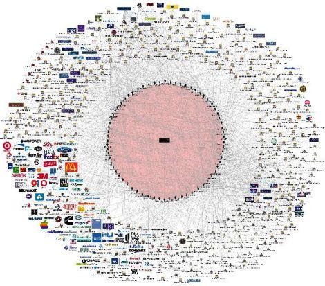 График показывает связи членов с корпорациями, благотворительными организациями, политическими группами и СМИ. Считается, что группа контролирует мировую экономику.