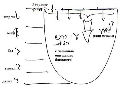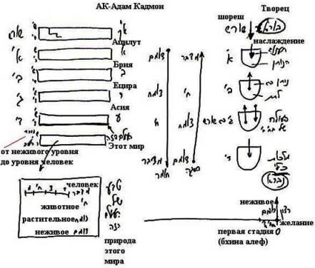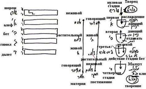 Таким образом, из этих четырех стадий затем происходит развитие миров. Здесь тоже есть стадии шореш, алеф, бет, гимел, далет, и в каждой и каждой из них также происходит развитие от нулевой (шореш) до четвертой (далет) стадии. Так продолжается до Бесконечности, и каждая деталь творения состоит из четырех или можно сказать пяти стадий, составляющих эту модель, основу творения.