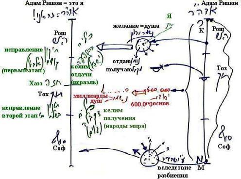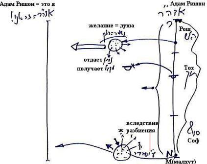 В каждом есть весь Адам Ришон в перемешанной, запутанной форме и во всем этом переплетении только одна точка принадлежит ему, а все остальные он приобрел благодаря разбиению. Если он берет свою основную точку и делает на нее цимцум – сокращение, а относительно всех остальных душ развивает желание отдачи, выходит из себя, и благодаря этому начинает ощущать ближнего – сначала это происходит ради получения, а затем ради отдачи – то он приобретает все остальные души, все остальные желания. Из своей основной точки он приобретает все остальные. И таким образом каждый становится равен Адаму Ришон.