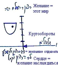 Существует временна́я ось. После определенного периода развития, человек обретает точку чистой души. И она облачается в сердце человека, то есть в его желание наслаждаться, раскрывающееся преимущественно в сердце. Итак, «сердце» – это желание, а «точка в сердце» – это своего рода обратная сторона чистой души. Мы называем ее «Божественной частью свыше», это нечто относящееся к Бине, к свойству отдачи. Давайте наименуем ее на чертеже «желанием отдавать» – это не само желание отдачи, но что-то от него.