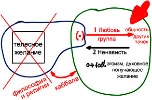 А кроме того, у меня есть точка в сердце (•). Я развиваю ее, соединяясь с общностью других точек, чтобы достичь любви, – и тогда в ответ чувствую отторжение, ненависть. И вот здесь-то, поистине с нуля и до 100%, сообразно моим усилиям, во мне начинает развиваться подлинный эгоизм – духовное получающее желание. Это происходит именно в то время, когда я начинаю вступать в группу, в правильное окружение.