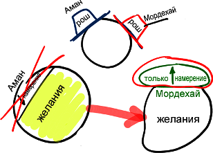 Вначале все мои сосуды-желания являются эгоистическими (↓). И всё это – "Аман". С другой стороны, "Мордехай" – это намерение на отдачу (↑). Так вот, мы должны только перенести свои желания от одного намерения к другому. Тем самым мы умертвляем "Амана" и возвышаем "Мордехая".