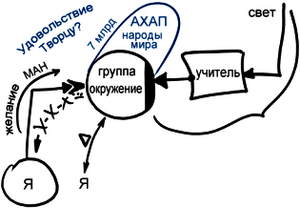 Такова схема происходящего: учитель дает свет группе, или окружению, а я получаю свет в мере своей способности подключиться к товарищам. Ведь тем самым я формирую свою просьбу об исправлении (МАН), свое устремление, свое желание, свою потребность. Если я не соединился с товарищами, то и желания у меня нет, и света я от них не получаю. Зато, подключившись, я не просто создаю некую "отводную трубку" для света (X-X-X) – нет, я нахожусь в группе, внутри, и там получаю его.