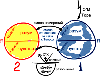 Есть два состояния: текущее (1) и следующее (2). В каждом из них у меня есть чувство и разум. И здесь, и там у меня есть наполнение, но в первом состоянии это дурное наполнение, а во втором – хорошее. Так вот, я приподнимаюсь и над тем, и над другим – и прошу новый сосуд, новое чувство, новый разум. Я прошу заменить мне не наполнение, а "сердце" и "мозг".