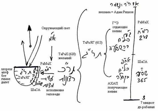 Но постепенно остальные 613 желаний входят все больше в действие. Это называется, что он работает с 613 желаниями в глубину – сначала шореш, потом алеф в 613 желаниях, потом бет в 613 желаниях, гимел и далет.