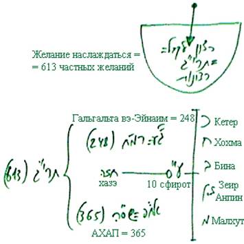 Как мы уже изучали, существует душа, сосуд. Творец создал желание. Желание это претерпело развитие в том, что касается осознания себя самого. Оно состоит из 613-ти частей. Желание наслаждаться = 613 частных желаний. Такова ситуация. Мы учим, что это желание подразделяется на Кетер, Хохму, Бину, Зеир Анпин и Малхут – всего десять сфирот. Позже мы делим их на 248 желаний Гальгальты вэ-Эйнаим над хазэ и на 365 желаний АХАПа под хазэ.
