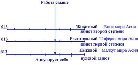 Средство, при помощи которого человек исправляет себя на неживом уровне, – это выполнение Торы и заповедей без намерения, т.е. в состоянии ло-лишма. Средство, при помощи которого человек достигает исправления растительной ступени на первом уровне авиюта 613-ти желаний, – это выполнение Торы и заповедей с намерением, т.е. ради доставления удовольствия Творцу. Растительная фаза включает развитие во всех 613-ти желаниях, на все 10 сфирот. А исправление 613-ти органов-желаний на животной ступени достигается уже при помощи света Бины, т.е. посредством занятий «тайнами Торы» и «вкусами заповедей».