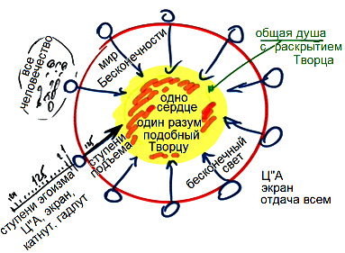 Мы находимся в круге, и если каждый отменяет себя и добавляет к этому кругу свое желание, то мы строим внутри круга особую область общей отдачи, общего желания. Каждый из нас отменяет себя, делает на себя первое сокращение (цимцум алеф), экран и пытается пребывать в отдаче всем.