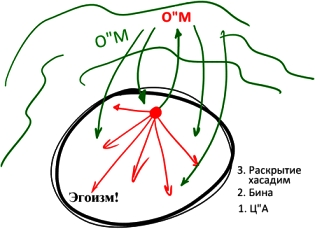 Затем (2) ты устремляешься к Бине, хочешь, чтобы в тебе воцарилась сила отдачи. Это приводит тебя к некоему раскрытию (3). И пускай ты раскрываешь только свет хасадим, все-таки это уже что-то. Так, постепенно, ты сбрасываешь с себя покровы, снимаешь сокрытие…