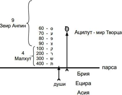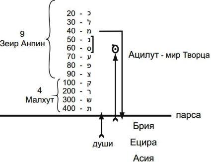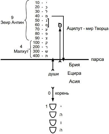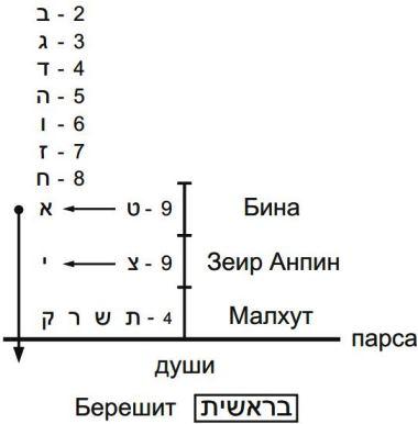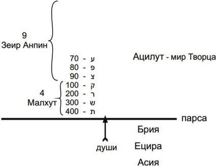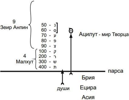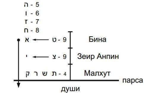 Есть буква «вав» – вертикально стоящая палочка с утолщением наверху. Эта же палочка, стоящая под углом в 45 градусов, обозначает возможность (только лишь) прохождения света, а буквы «юд», находящиеся сверху и снизу, показывают, что свет из Высшего мира действительно проходит под парсу.