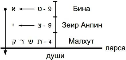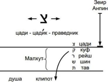 Буква «цади» стоит выше. Она последняя буква парцуфа Зеир Анпин, и поэтому именно она проводит свет из Зеир Анпина в Малхут. Она полностью находится в свойстве отдачи. Отсюда и «цадик» (праведник).