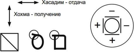 Эти формы и есть буквы, каждая из которых и каждый элемент которых указывают на то, что существует определенное совмещение сил получения и отдачи, образующее такую систему. Практически, это всего лишь две вертикальные и две горизонтальные пластины (минус, плюс) – как на экране осциллографа – между которыми создаются некие фигуры.