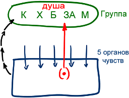 Если же я развиваю в себе еще один орган чувств, призванный ощущать ближнего, то это ощущение разделяется в моем восприятии на пять частей: Кетэр (К), Хохма (Х), Бина (Б), Зэир Анпин (ЗА) и Малхут (М). Развиваю я его из точки в сердце, желая выйти из самого себя и жить в группе, вместе с товарищами. Именно среди них я проявляю пять внетелесных органов чувств, представляющих мое духовное "тело".