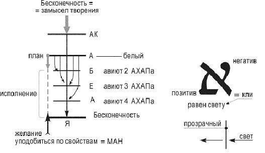 Для примера рассмотрим букву «алеф». Можно говорить о самой букве, о ее форме, а можно говорить и о белом фоне, который ее окружает, как бы о позитиве и негативе. То есть, информацию нам поставляет и белый фон, окружающий букву, и сама буква. И тем, что мы прочитываем букву, являющуюся кли, мы постигаем свет вокруг нее, свет, создавший это кли, наполнивший его и приблизивший к себе так, что кли стало равным ему. Это мы в конечном итоге и раскрываем.