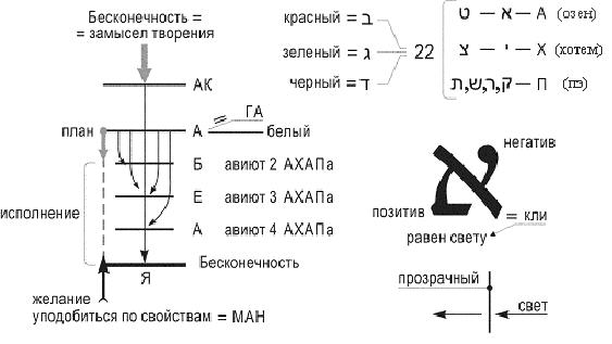 Но каждый из миров БЕА не только представляет собой АХАП и 22 буквы. Поскольку каждый из этих миров имеет свой авиют (бет, гимел или далет), он проводит свет своего определенного цвета: красного, зеленого или черного. Поэтому при прохождении света через мир Брия есть 22 красные буквы, через мир Ецира – 22 зеленые буквы, а через мир Асия – 22 черные. Каждый мир проводит все 22 буквы, только в ином цвете.