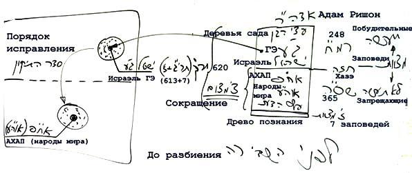 Итак, общая душа включает Гальгальту вэ-Эйнаим – это как бы будущий Исраэль. Пока что в Адам Ришон это не называется Исраэлем; назовем это «всеми деревьями сада». А также она включает в себя АХАП, называющийся «народами мира». Разумеется, нижняя часть была под Сокращением, ею нельзя пользоваться. Таково состояние перед разбиением.