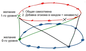Если каждый отменяет себя, то мы начинаем подниматься, получаем добавочный эгоизм. Допустим мы были вместе и достигли некой связи, от которой каждый получил какую-то силу, позволяющую ему отменить себя перед товарищами.
