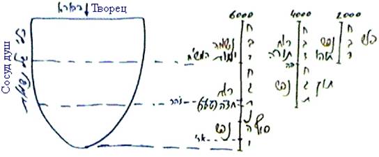 Красный сектор на чертеже обозначает пласт нашего поколения. На этом отрезке души находятся посередине или ближе к его краям. Некоторые сильнее тянутся к учебе, к раскрытию Божественного, они ближе к этому, им это легче дается – не из-за исключительности сосудов, а вследствие общей структуры души. Такие люди располагаются посередине, остальные же разбросаны по шкале вправо и влево. В общем взаимовключении душ есть «конечности»: «руки», «ноги», т.е. части более «разбросанные» – и есть части, которые ближе к центру. Однако каждая из них все равно относится к тому пласту авиюта, который сейчас раскрывается в нас. Авиют растет по мере углубления в сосуд сверху вниз, с нулевого уровня и до самого конца, когда должна раскрыться последняя стадия четвертого уровня (далет дэ-далет).